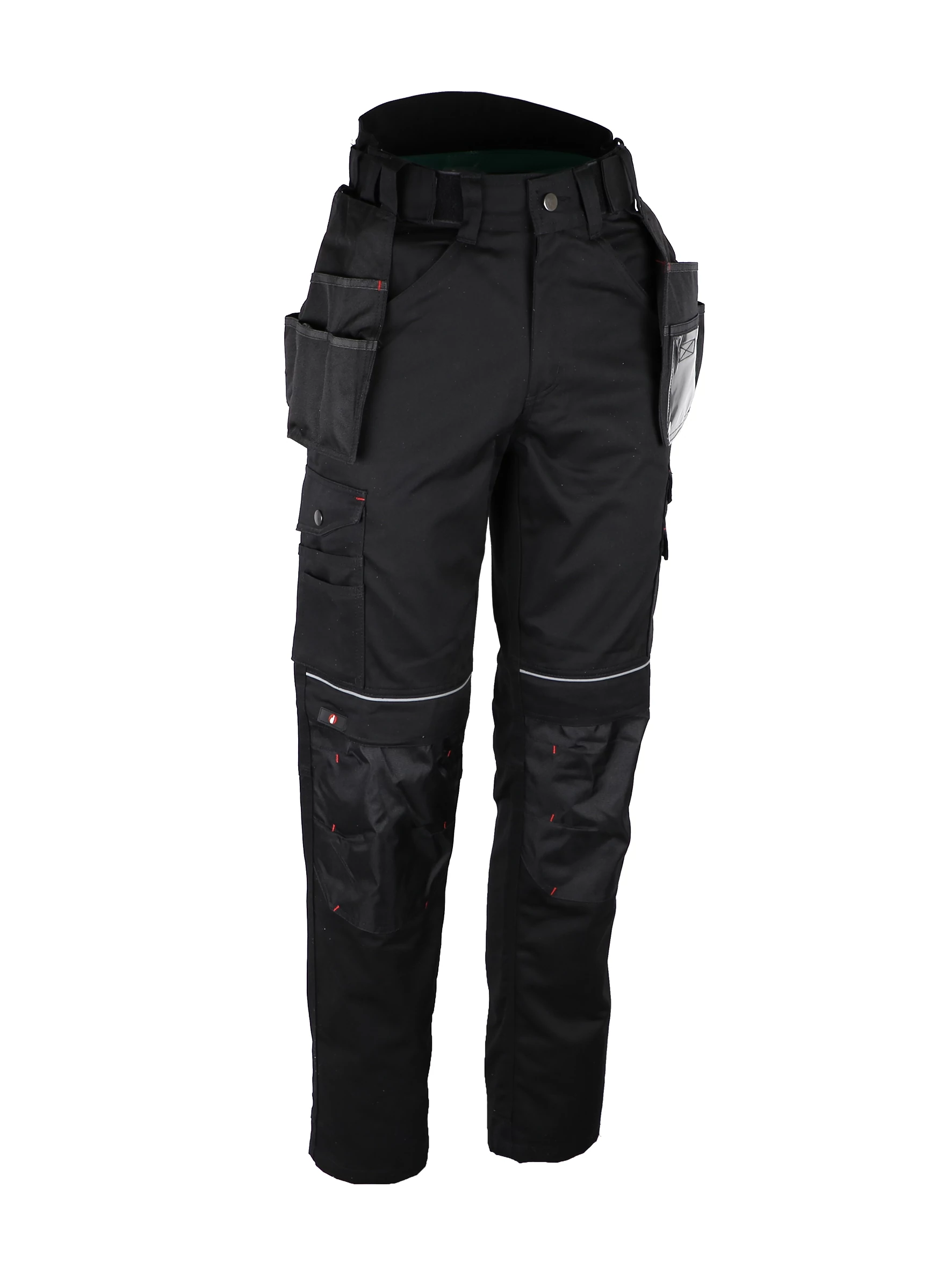 Fényvisszaverő csíkok. Kalapács hurok. Megerősített szövetből készült térdvédő zsebek.
